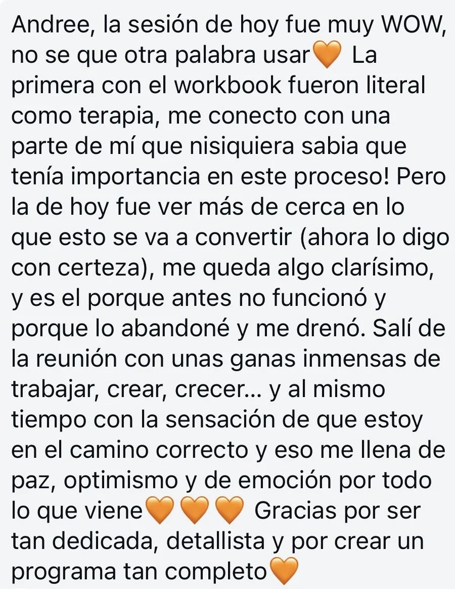 5 sesiones de 3 horas donde te acompaño, te guío en el proceso y te brindo todas las herramientas que necesitas para darle claridad, estructura fluidez y confianza a tu proyecto.